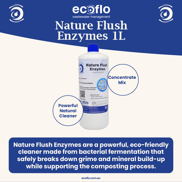 Nature Flush enzymes are a natural detergent, derived from bacterial fermentation, that does not harm the culture of microorganisms in the compost pile. Dilute the concentrate to clean the toilet bowl and seat. The enzymes act as catalysts, breaking down grime and mineral deposits into their basic elements, and helping to accelerate the composting process.