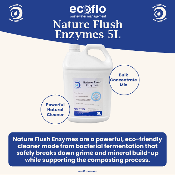 Nature Flush enzymes are a natural detergent, that does not harm the culture of microorganisms in the compost pile. Dilute the concentrate to clean the toilet bowl and seat. The enzymes act as catalysts, breaking down grime and mineral deposits into their basic elements, and helping to accelerate the composting process.